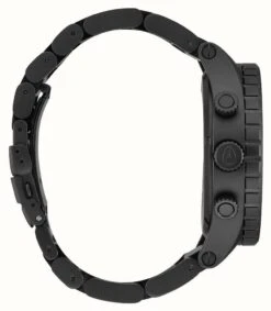 - This model exhibits a black chronograph dial with gold hour, minute and second hands.