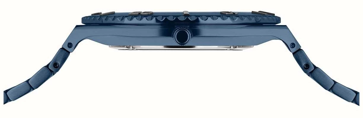 - A blue bezel and a blue stainless steel case frame the dial. The case measures 43mm in diameter and 8mm in height.