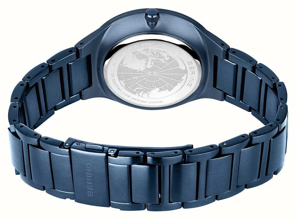 - The watch is finished with a blue stainless steel bracelet that fastens with a folding clasp.