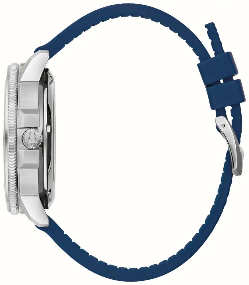 - The stainless steel case features a blue bezel and measures 45mm in diameter. It features an exhibition case back.
