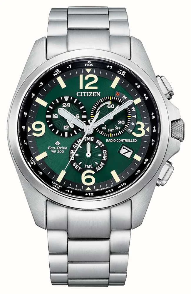 - The watch exhibits a green chronograph dial that features Arabic and baton indices.Â