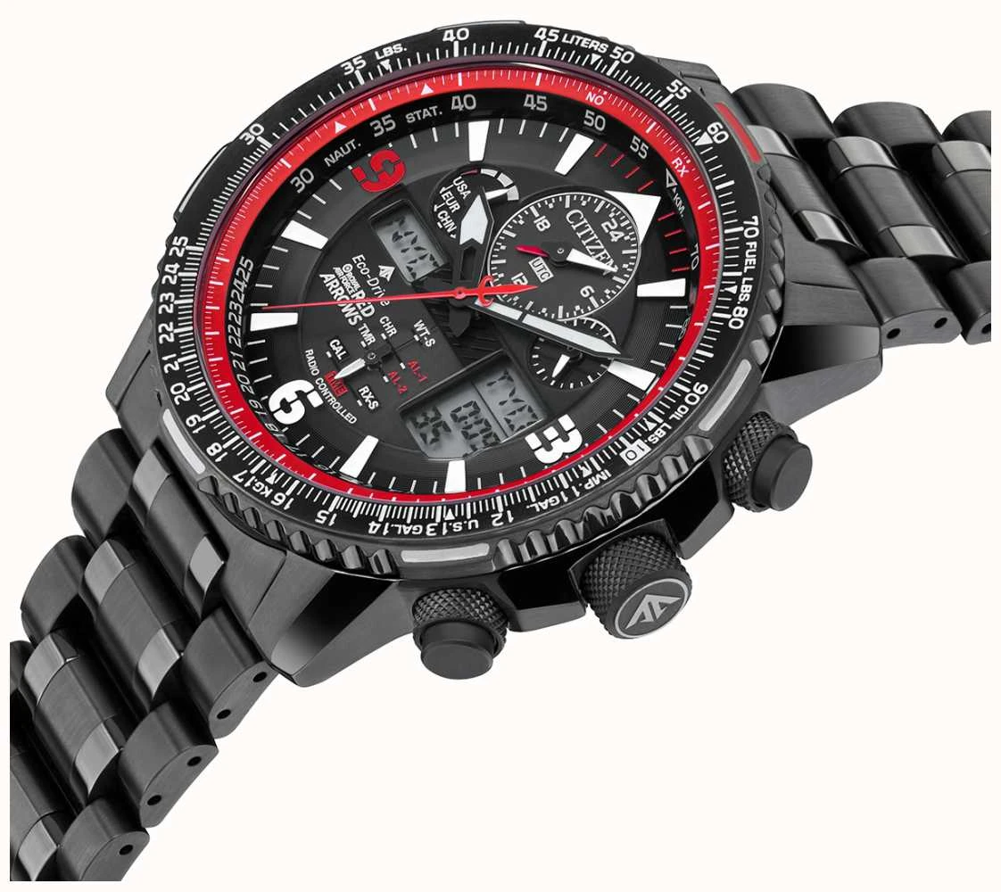 - This Red Arrows watch exhibits a black hybrid dial that features baton indices.Â