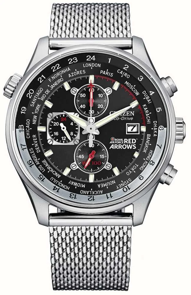 - This Red Arrows watch exhibits a black chronograph dial that features baton indices.Â