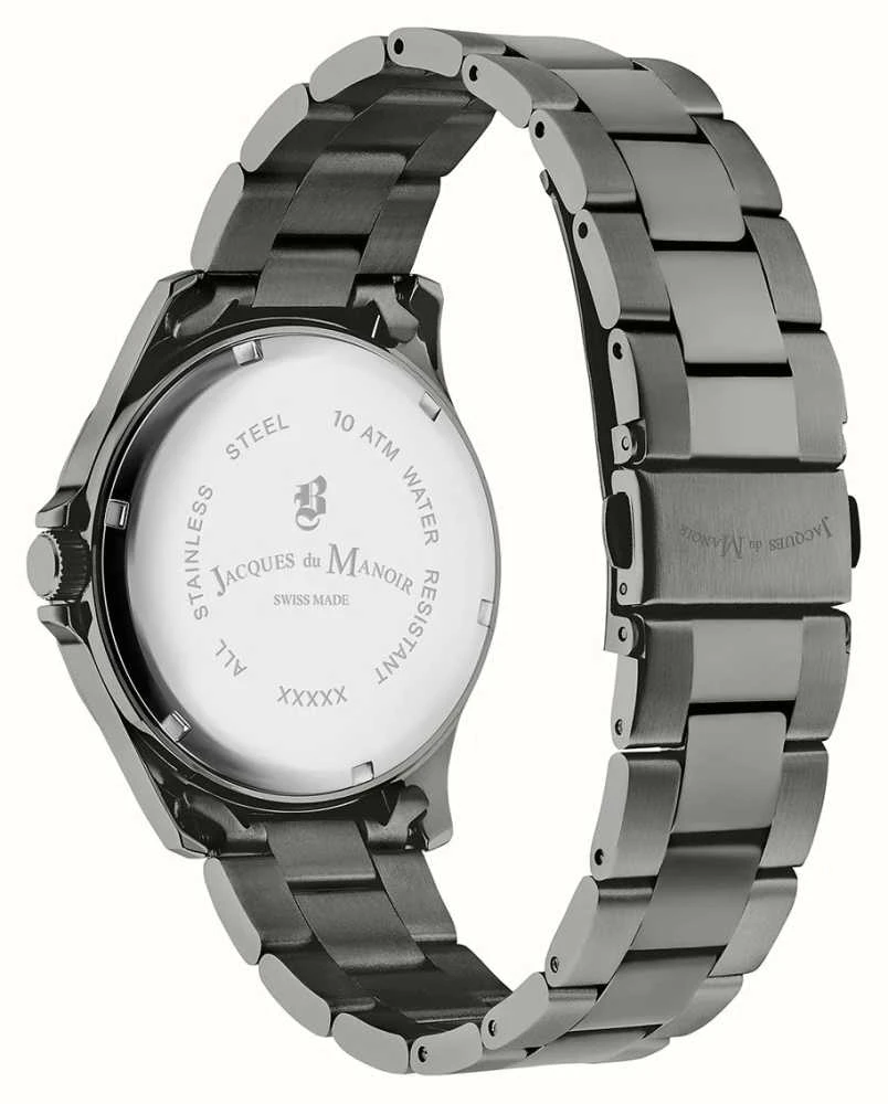 - Securing the watch to the wrist is a gunmetal-platedĀ stainless steel bracelet.