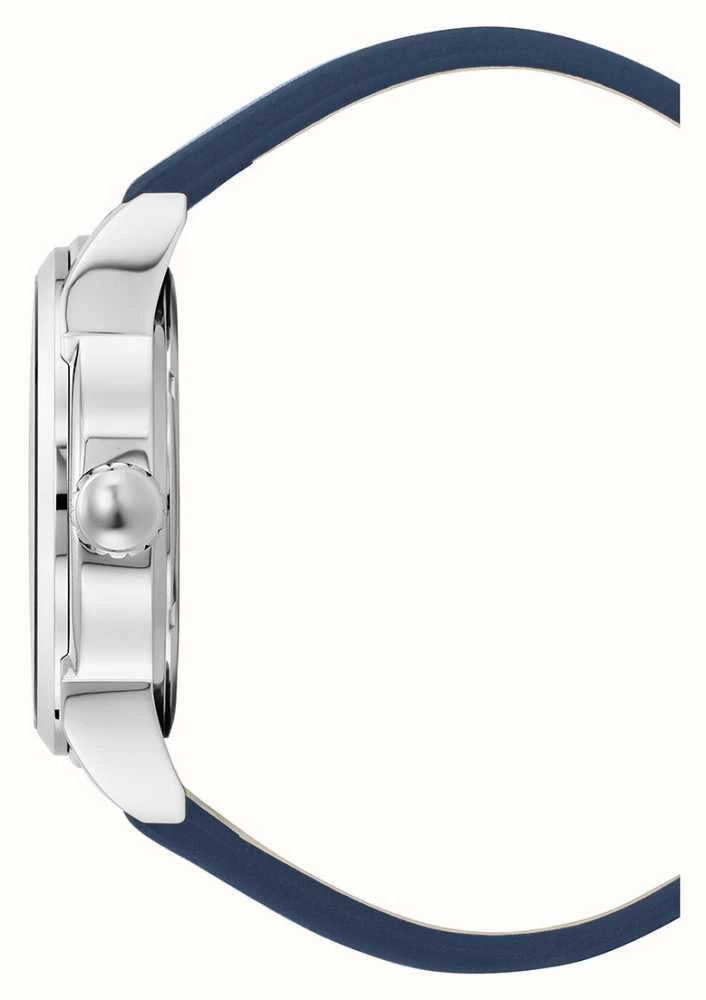 - The blue textured dial features silver-tone applied indices as well as silver-tone hour and minute hands. The second hand is red.