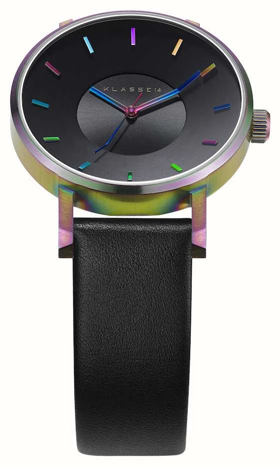 - The rainbow indices and hands on the watch tie in the modern design.Â