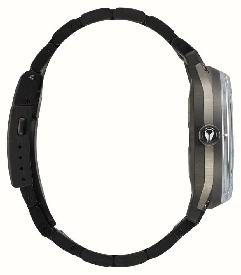 - Securing the watch is a black IP plated stainless steel bracelet.