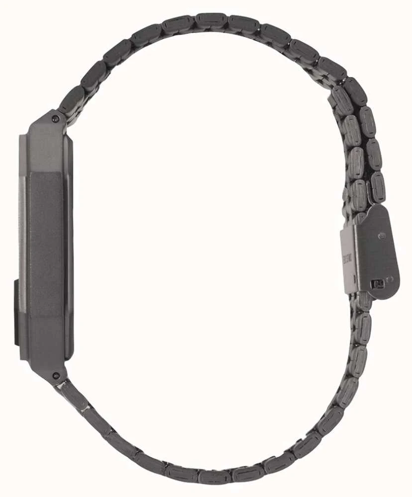 - Securing the watch is a gunmetal IP plated stainless steel bracelet.Â