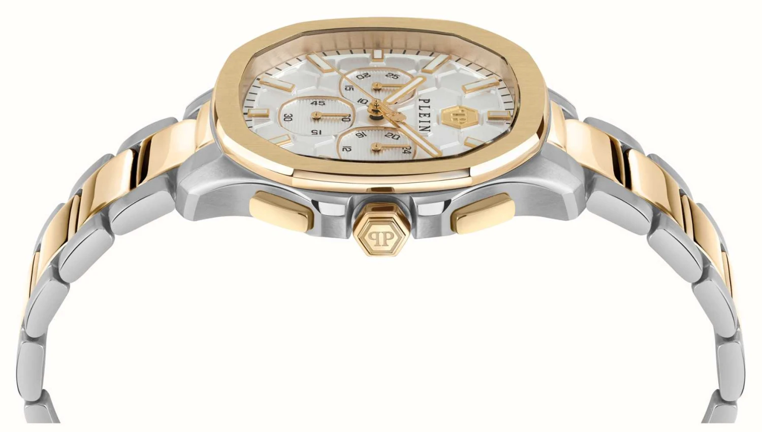 - The watch is secured using a two-tone gold and silver stainless steel bracelet.