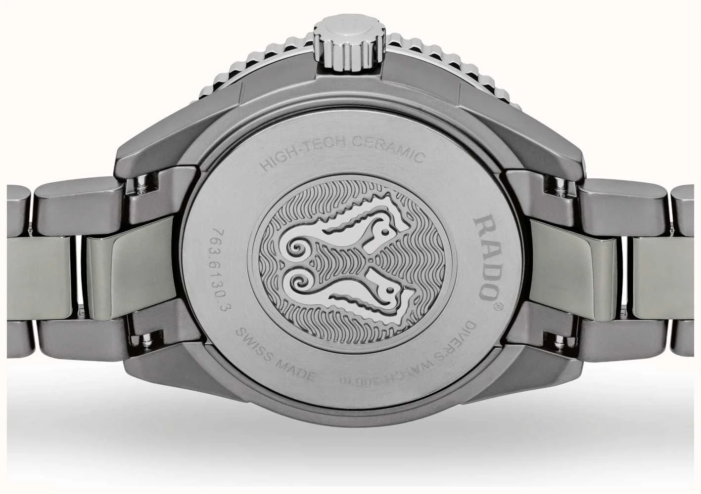 - The case back of the watch is brushed titanium stamped with Rado’s two seahorse design.Â