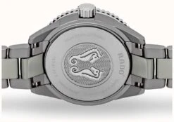 - The round 43 mm case is made from grey high-tech ceramic. The case measures a thickness of 14.6 mm and sports a screw-down crown.