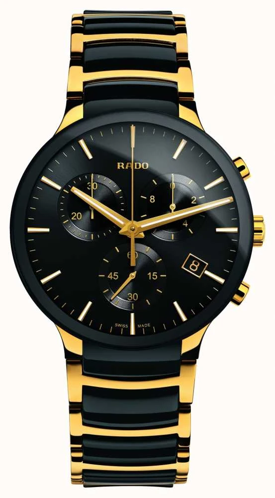 - The Centrix Chronograph model’s case and bracelet are made of a mix of PVD coated stainless steel and the signature Rado high-tech ceramic. The case and bracelet are black with metallic yellow details, crown and push-pieces.Â