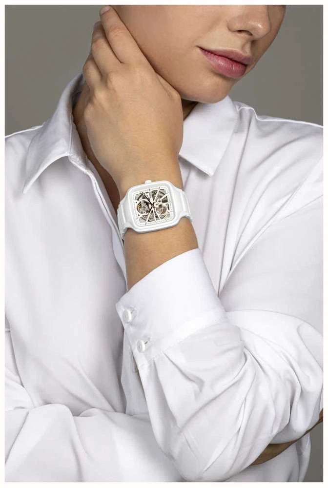 - This model exhibits a white and rose gold-tone square skeleton dial.Â