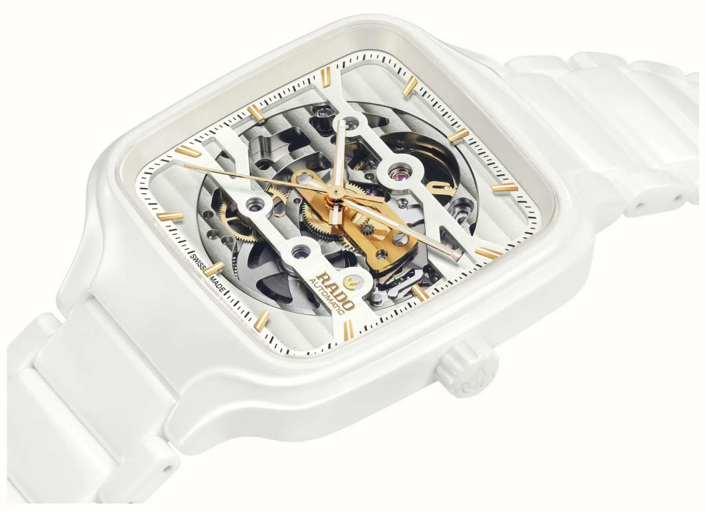 - The white square case retains the easily recognizable Rado silhouette. The case and bracelet are made of plasma high-tech ceramic with titanium features.