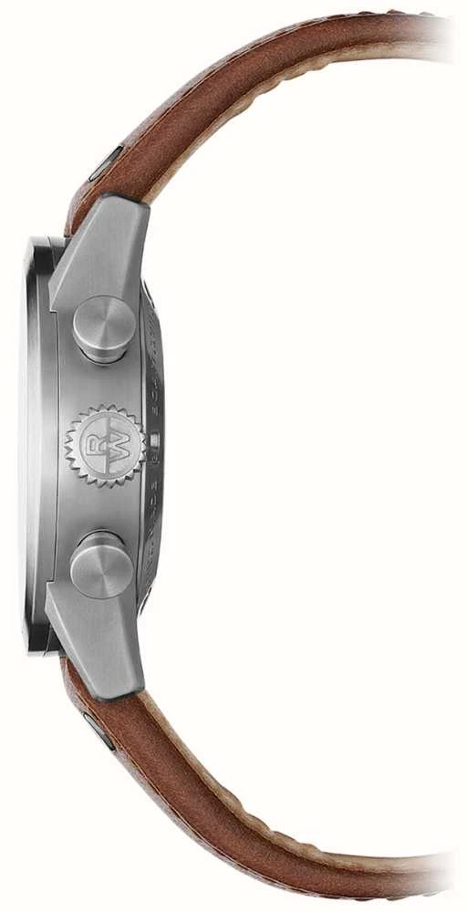 - Securing the watch is a brown leather strap that fastens with a folding clasp.