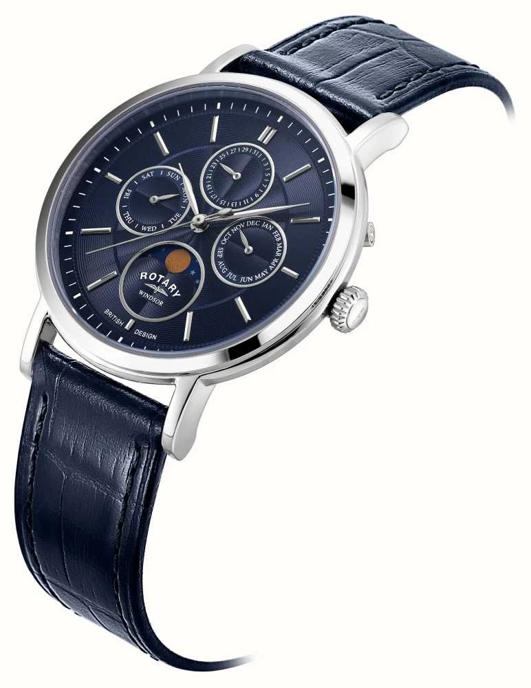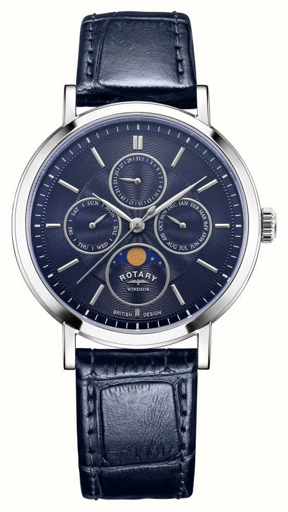 - The dial features silver baton indices and silver hands. Four sub-dials provide weekday, date, month and a moophase display.