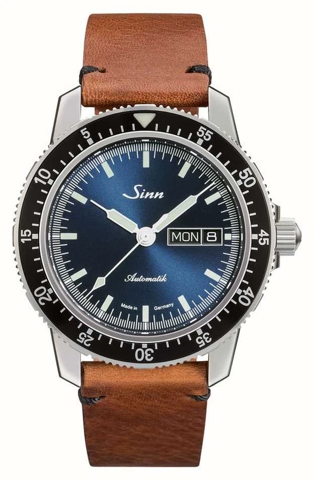 - This model is finished with a brown leather cowhide vintage-style strap. It has decorative black stitching and fastens with a pin buckle. The buckle features the Sinn logo.