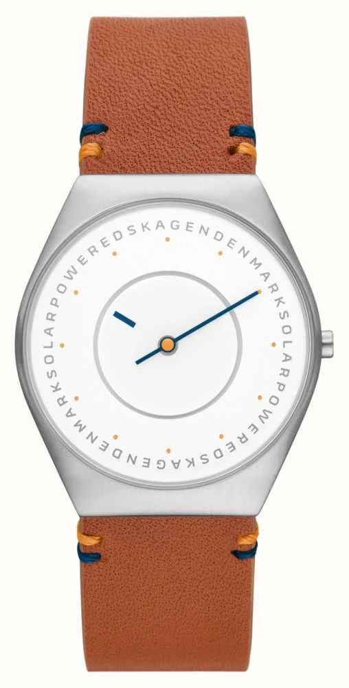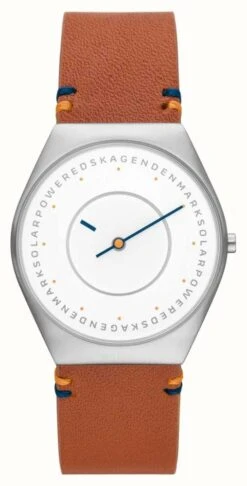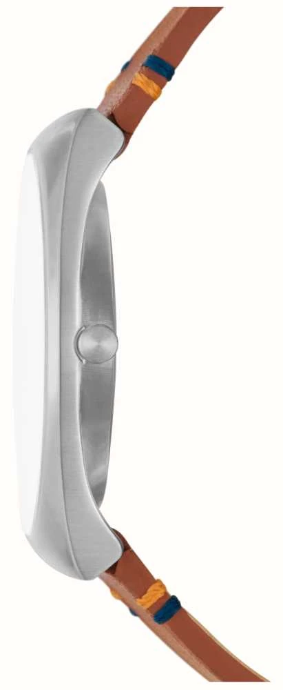- Securing the watch is a warm brown leather strap with contrast stitching details.