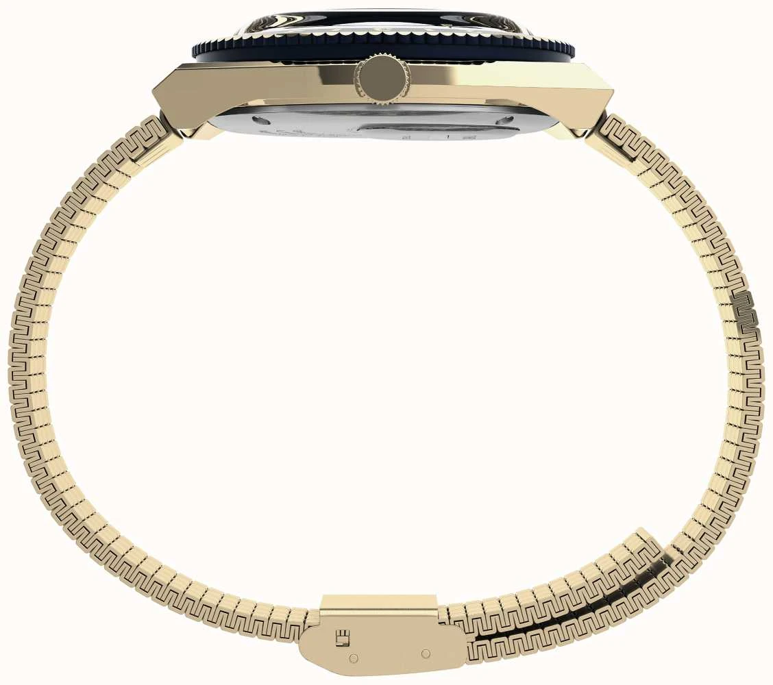 - A gold plated stainless steel case frames the dial. It measures 38mm in diameter and 11.5mm in depth.