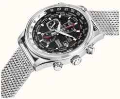 - The watch’s stainless steel case measures 46 mm in diameter.