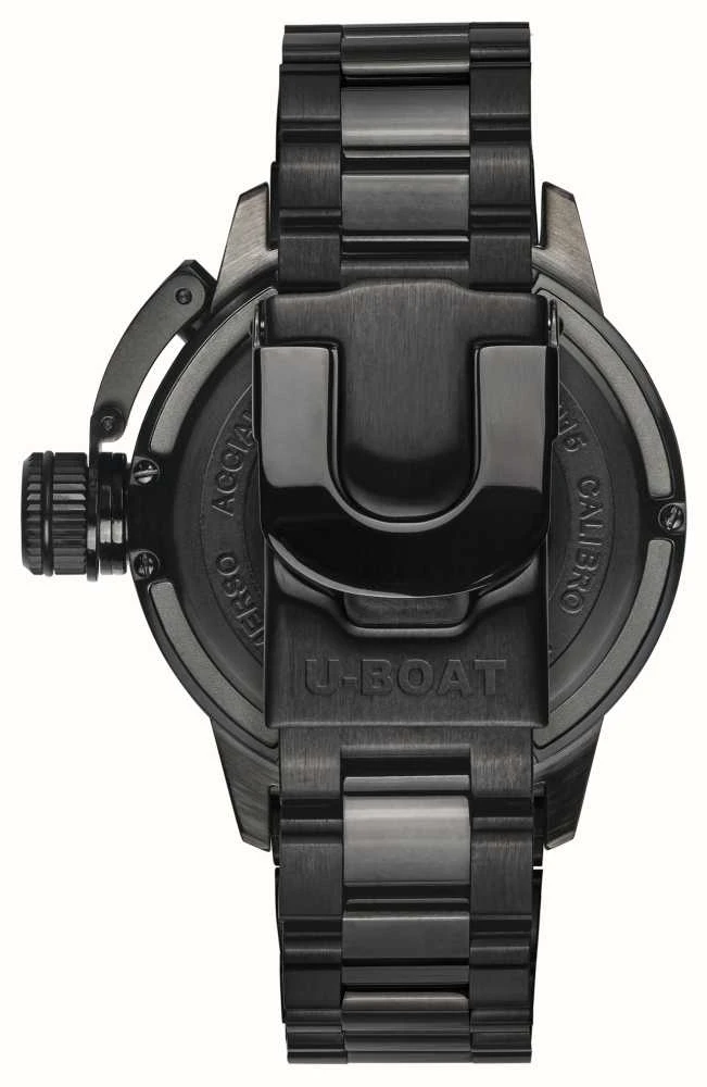 - The crown is placed at the left hand side and is fitted with U-Boat’s patented crown protection system.